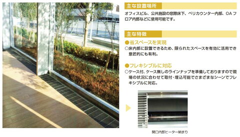 【ペリメーター用床埋込型ヒーター】ぺリメーター処理( コールドドラフト・結露防止) として設置する時、意匠的にヒーターを室内に露出したくない場合には、床下にヒーターを埋込むことも可能です。