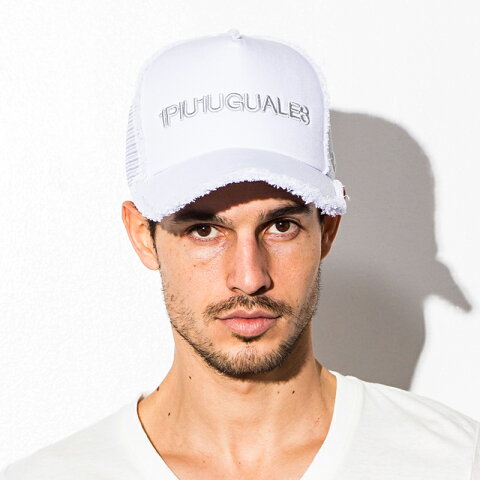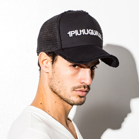 生地の端を切りっぱなしで仕上げた、ロゴ刺繍入りメッシュキャップ。