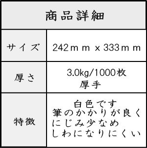 商品詳細 サイズ 242x333 100枚入り 厚さ 3kg/1000枚 厚手 特徴 和紙の柔らかな上品な自然色です 厚手で腰がしっかりしています かすれについて 摩擦の値について紙の上を、左記写真の愛媛県紙産業技術センターにある摩擦測定器を滑らせ紙の 摩擦度を測定いたしました。