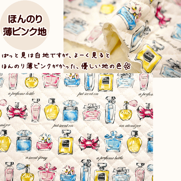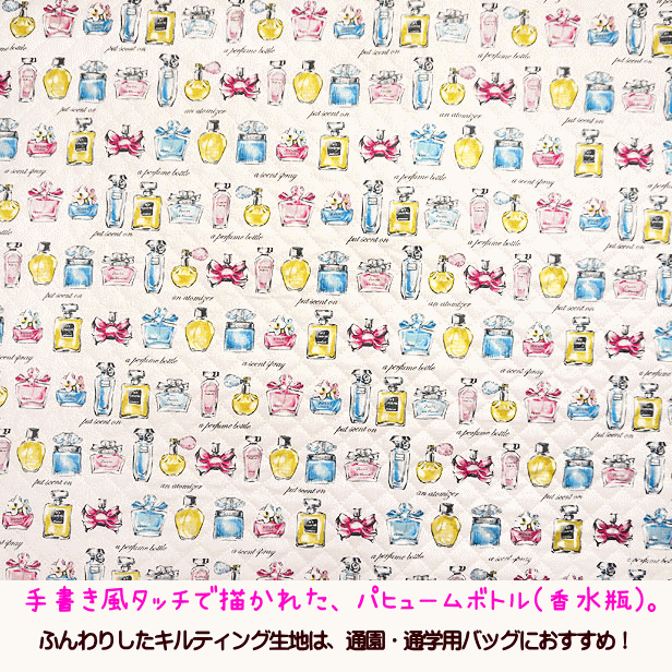 ■生地をご購入の前にお読みください キルト 生地 キルティング生地 パヒューム 並んだ香水瓶 香水 パヒュームボトル レッスンバッグ生地 おしゃれ 綿100% キルティング 通園 通学 入園 入学キルティング生地 (パヒューム 並んだ香水瓶) キルティングは季節商品のため生産量が少なく、 売り切れますと 次の入荷がない場合が多いのでお早めにご検討ください。