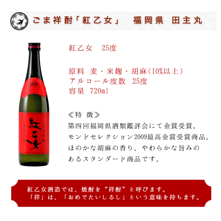 産地 内容量 360ml 商品サイズ 310mm×65mm×65mm 度数 25度 原材料 麦・米麹・胡麻 焙煎胡麻10%以上使用 製造元 株式会社紅乙女酒造 福岡県久留米市田主丸町益生田214-2